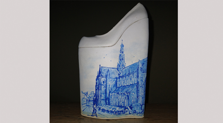 Haarlem Hoog, alkydverf op leer, schoenontwerp Simone Memel.
